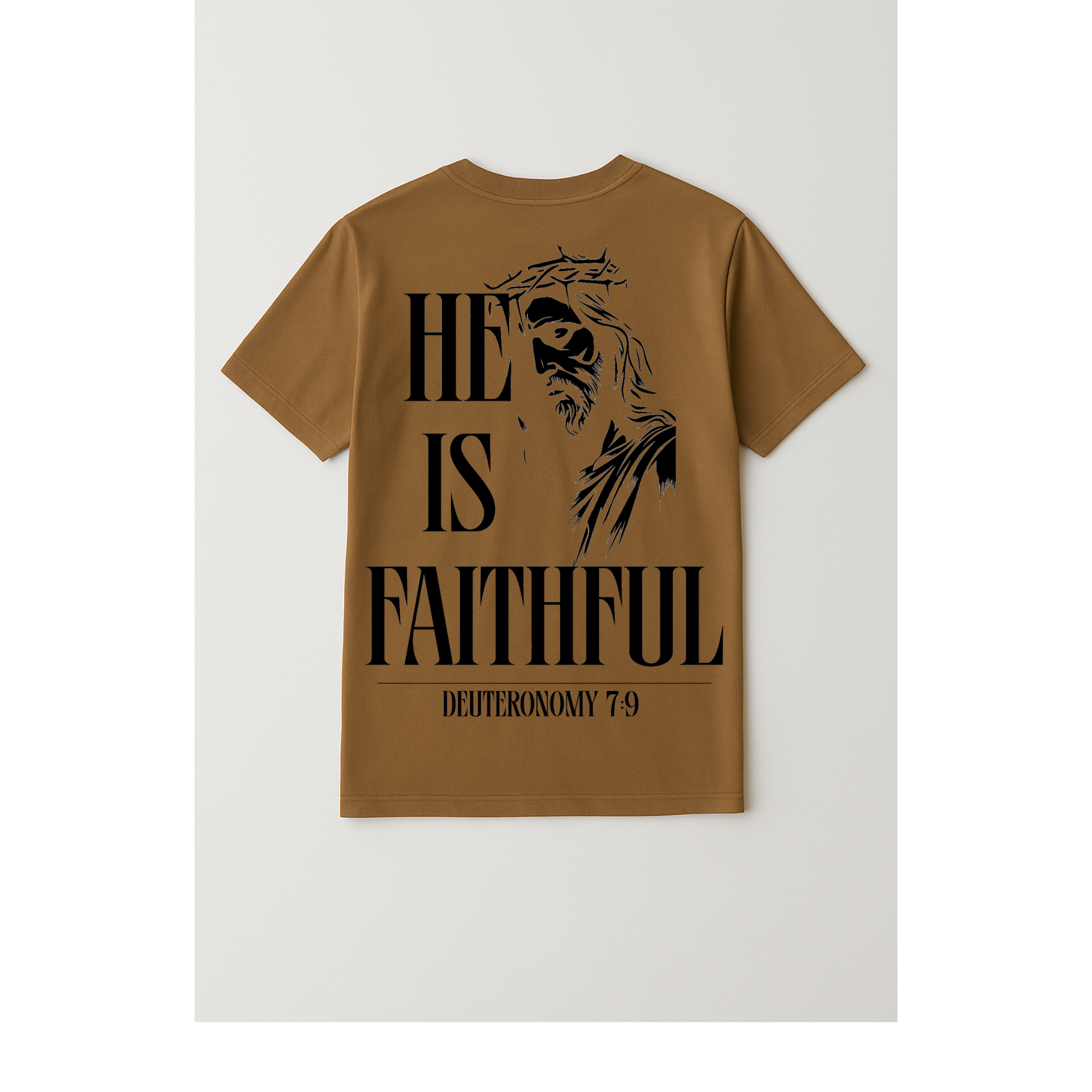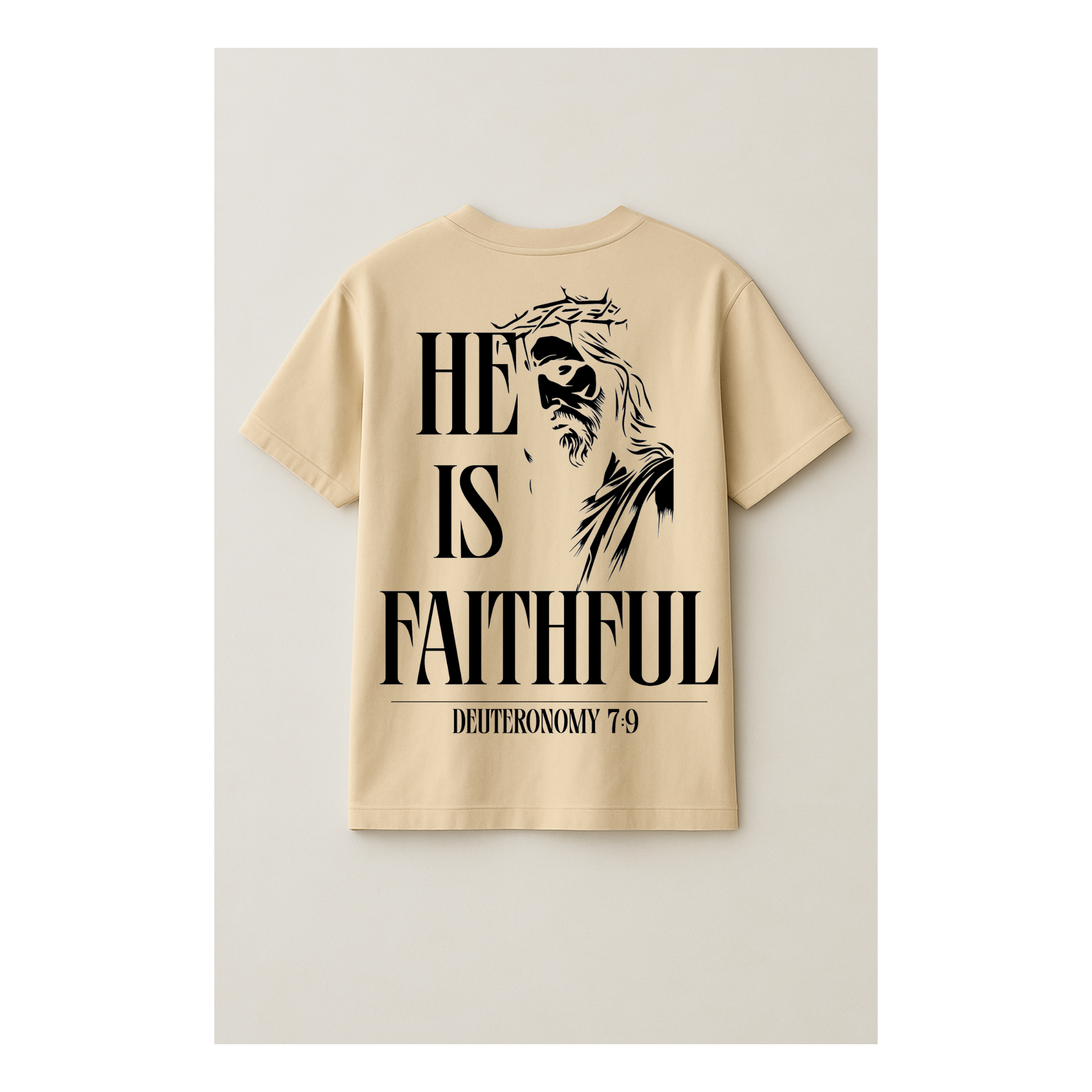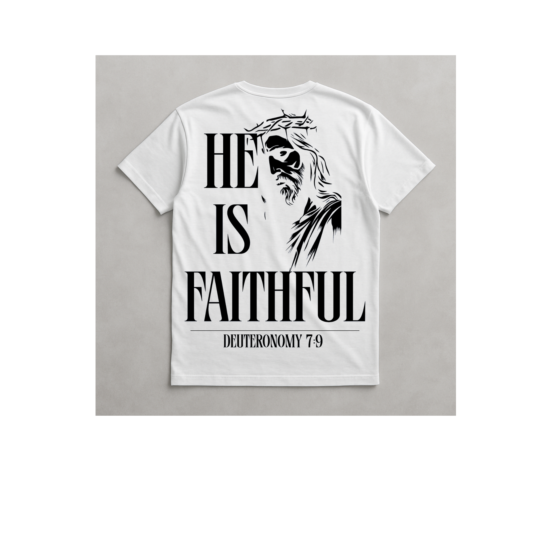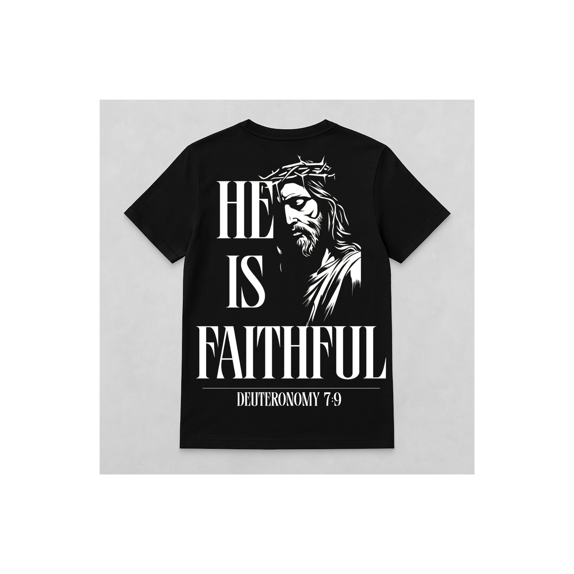 Striking crown-of-thorns artwork paired with bold “HE IS FAITHFUL” print